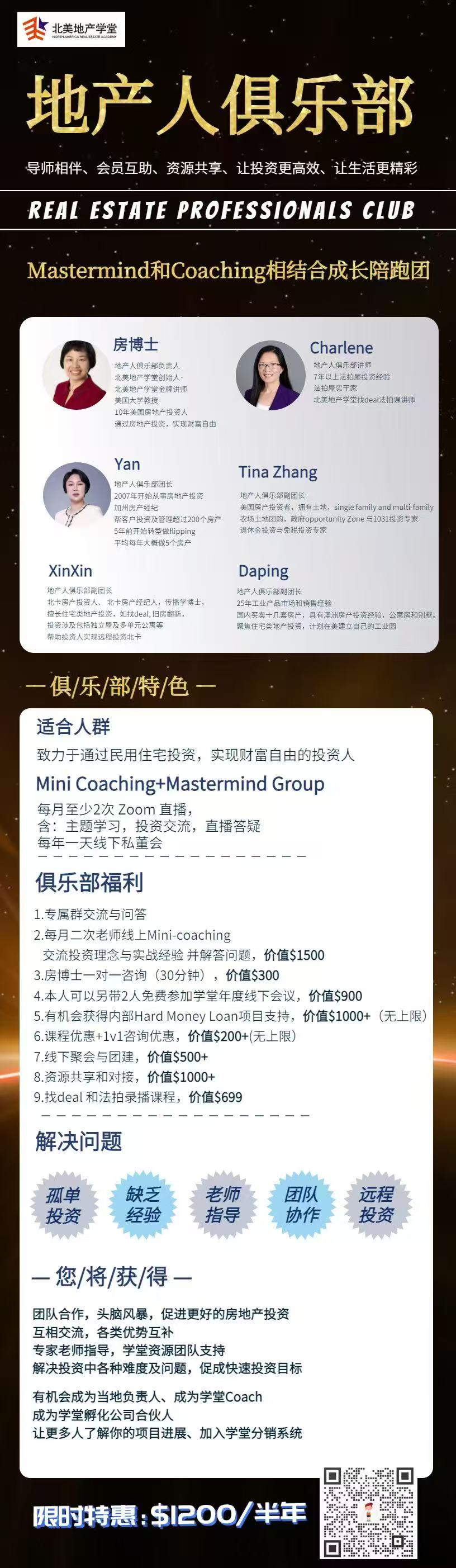 地产人俱乐部即于2024年1月启航,与认可学堂且有一定房地产投资经验的学堂学员共同组建,利用学堂在美国房地产方面优势,布局全美房地产市场,帮助学堂学员投资人在民宅投资方面有更好更快更稳健的发展!