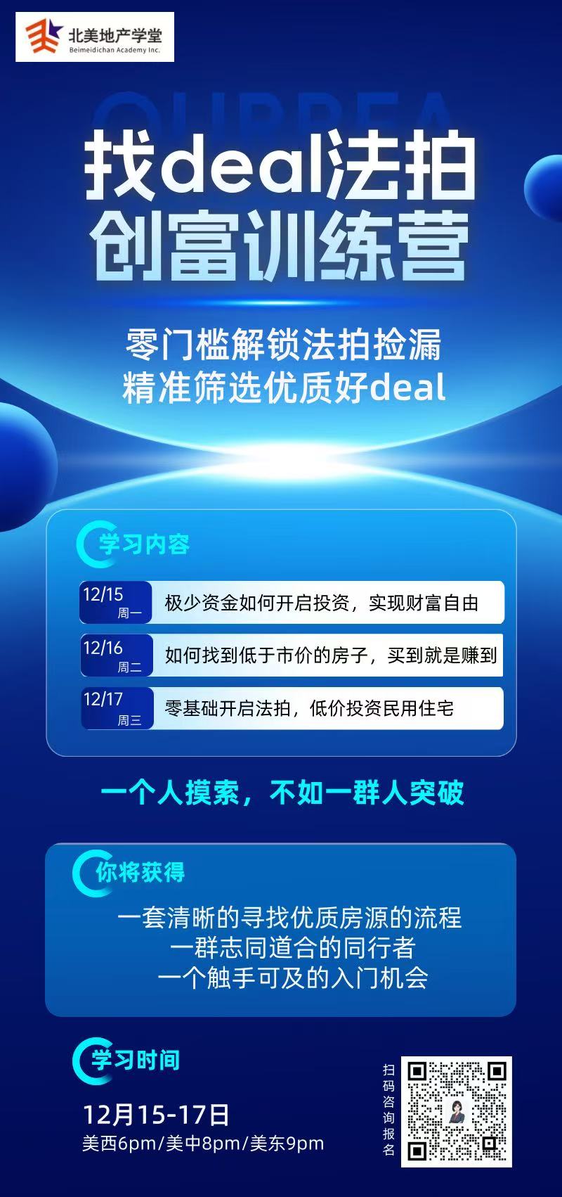 全程纯干货输出,不讲虚的!扫码锁定名额,一起掘金北美法拍市场👇