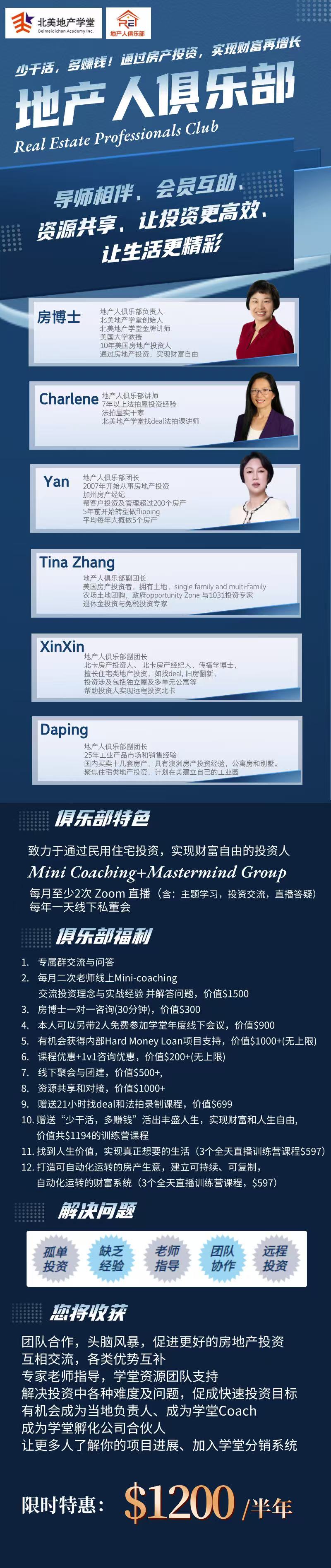 地产人俱乐部即于2024年1月启航,与认可学堂且有一定房地产投资经验的学堂学员共同组建,利用学堂在美国房地产方面优势,布局全美房地产市场,帮助学堂学员投资人在民宅投资方面有更好更快更稳健的发展!